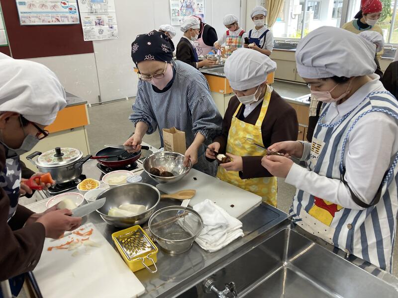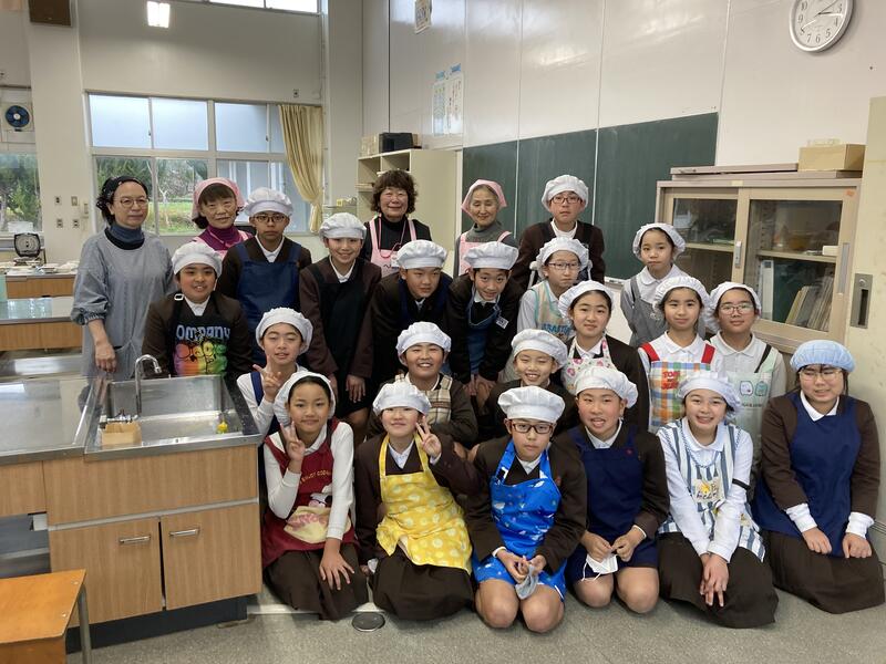 2月14日(水)総合的な学習の時間に、地域の農家さん(三田村さん)の畑で野菜づくり体験をさせてもらったり、郷土料理について調べ学習をしたりしてきた5年生。その集大成として、栖本の野菜を使って郷土料理(茶飯、けんちん煮、大根餅)を食生活改善推進員さん方に教えていただきながら作りました。