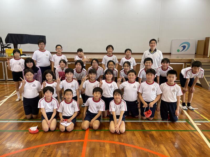 天草市スポーツコミッション子ども体力増進サポートプログラム「運動あそび教室」を通して、子供たちは多くのことを学びました。小学校の運動部活動がない今、3~6年生みんなで運動をする経験は貴重です。毎回、指導員の山下様から温かい励ましの声を掛けてもらい、生き生きと体を動かしていた栖本っ子たちでした。 写真:最終日に山下様と一緒に