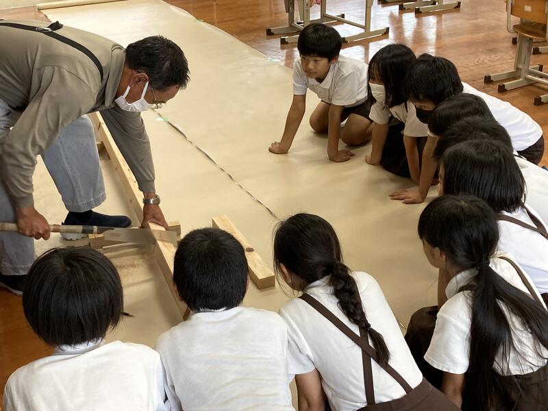 4年生の図画工作「ギコギコトントンクリエーター」の学習で、地域の木村さんにおいでいただきました。あっと言う間に美しい切り口で太い角材を切っていらっしゃる木村さんのノコギリ技に子供たちは見入っていました。