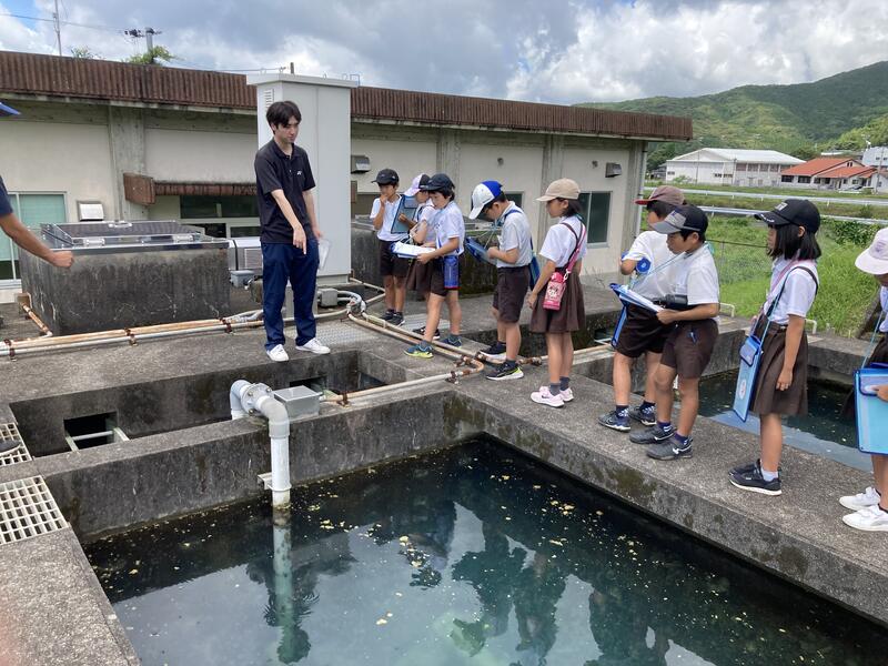 天草市水道課の杉本さんと松本さんが4年生に栖本浄水場の説明をしてくださいました。蛇口をひねると当たり前のように出てくる水ですが、施設内の機会が24時間稼働していて毎日2回ずつ点検してくださっていることを知り、水を大切にする気持ちが高まりました。