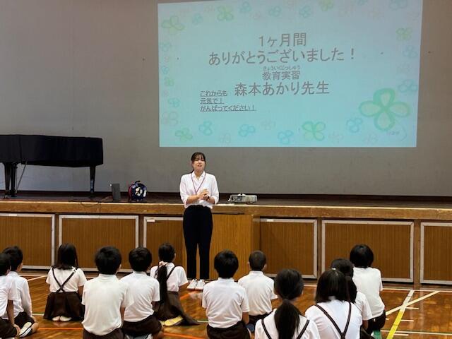 3年生を中心に9月24日から行われた森本先生の教育実習も10月18日が最終日となりました。子供たちは毎日「森本先生と昼休み一緒に遊ぶのが楽しみ!」と外へ駆け出し、笑顔いっぱい運動場を走り回っていました。常に全力投球の森本先生は、子供たちの「できた!分かる!」を求めて授業の工夫にも取り組んでいらっしゃいました。