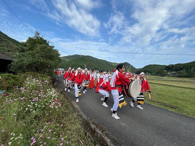 秋晴れの河内地区で御神輿行列と栖本太鼓の行列が行われました。前日のお下り行列も神秘的で美しいと評判の河内神社秋祭りです。神社では、青年団の皆様による栖本太鼓踊りが披露されました。