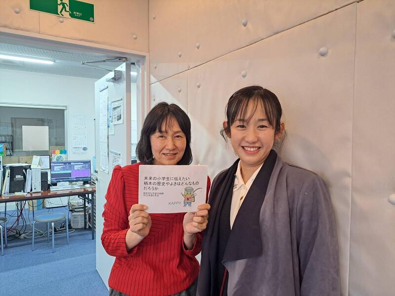 ラジオ放送後の石井教諭とラジオパーソナリティ森本さん