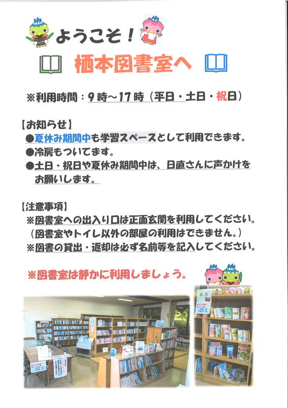 栖本支所から、栖本図書館のお知らせがありました。公共の場でのマナーやルールを守り、利用してください。