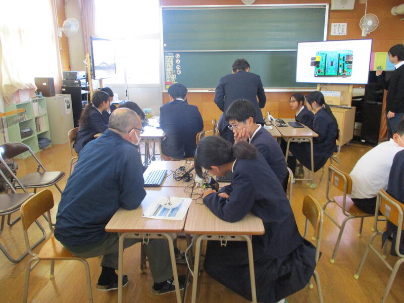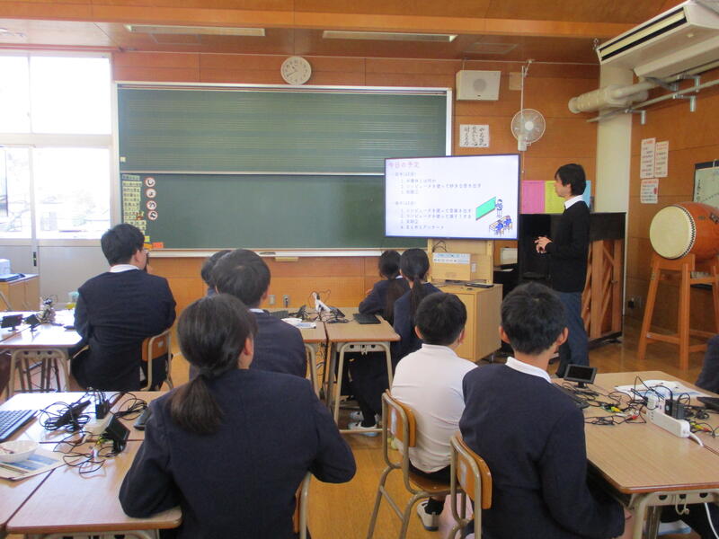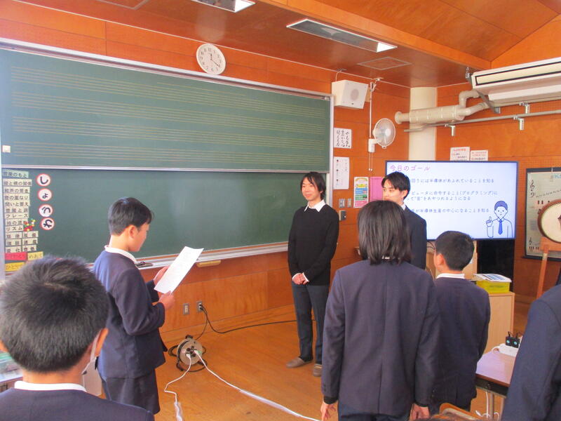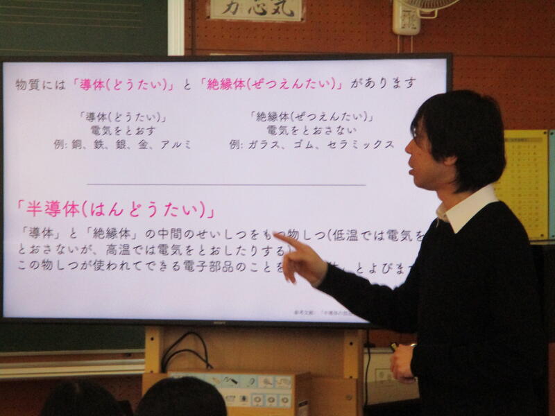 1月22日(木)に、半導体出前授業がありました。崇城大学総合教育センターから先生をお招きして、半導体を知り、体験する授業でした。半導体が車や家電等、とても身近なものに活用されていることを学習した後、実際に使う体験をしました。プログラミングソフトで、光を出したり音を出してメロディを演奏したりました。テレビ局の取材もあり、緊張していた様子でしたが、初めての体験に子供たちも目を輝かせていました。熊本の未来が、半導体によって豊かになる可能性が広がり、わくわくする授業でした、。崇城大学の先生からは、聞く態度や実験への班の協力体制が素晴らしいとほめていただきました。