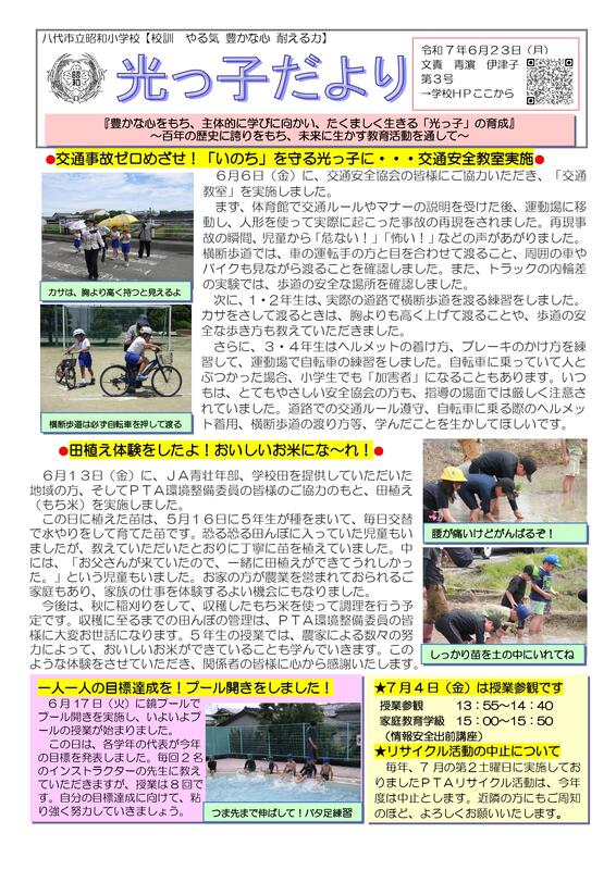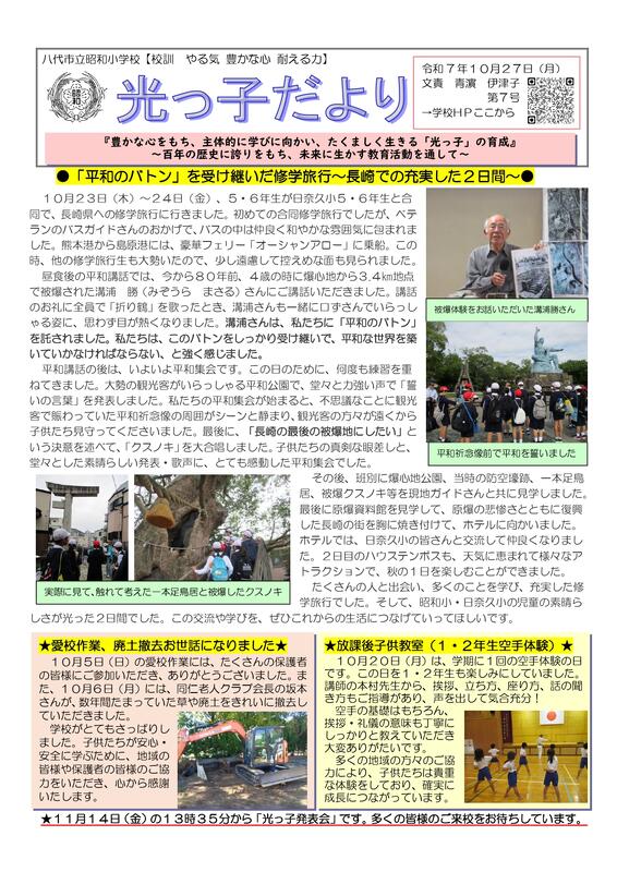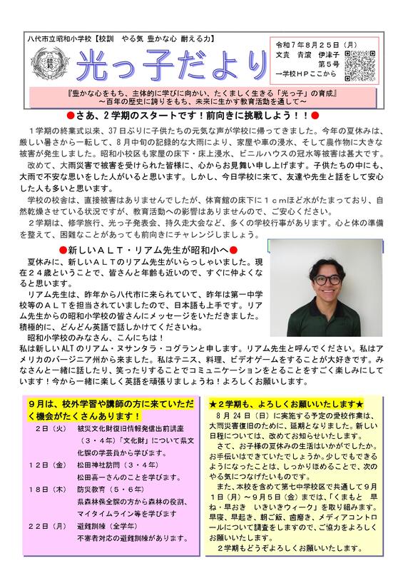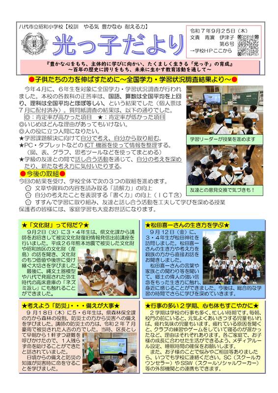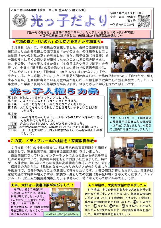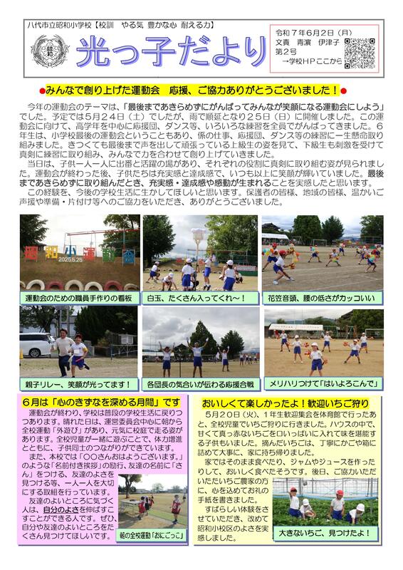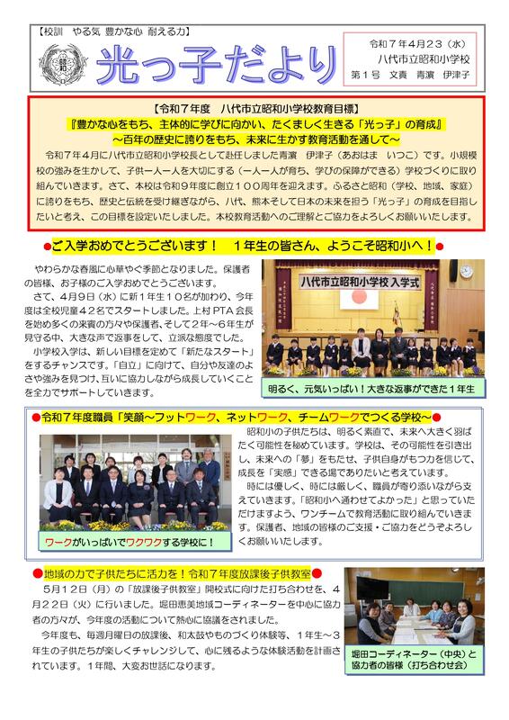 熊本県教育情報システム登録機関管理責任者 校長 青濵 伊津子 〒869-4722 熊本県 八代市昭和明徴町731-2TEL 0965-37-2025 FAX 0965-31-3013 令和7年度児童数42名