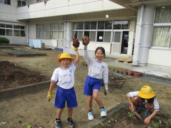 11月19日(水)に、1・2年生は、学級園に植えた「さつまいも」を収穫しました。夏の暑さに負けずに育って、大きさの大きな「さつまいも」が採れました!掘りたてのさつまいもは、1・2年生はもちろん、全校児童で分けて、各家庭に持ち帰る予定です。