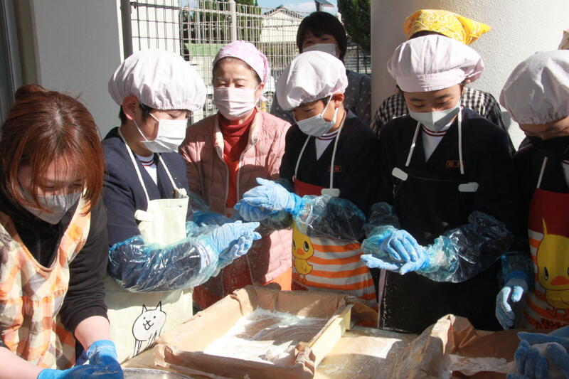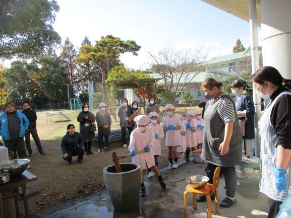 また、そのあとはPTAや地域の皆様とともに「もちつき」を行いました。もち米は、5年生が種をまいて、みんなで田植えして、そして収穫したものです。臼と杵で、交代しながら「ぺったんぺったん」とついたおもちをもち粉をつけて丸めて完成!家に持ってかえってたべたら、ほっぺたが落ちるくらいにおいしかったそうです!
