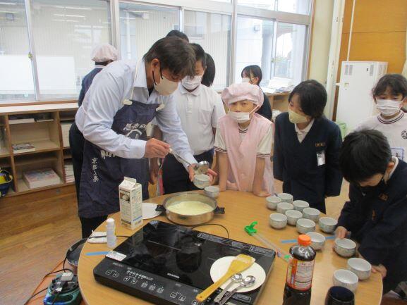3年生も「すがたをかえる大豆」の教材を学習していますので、一緒に豆腐作りに挑戦しました。温度を90度に温めた豆乳に、「にがり」を入れてしばらくすると・・・なんと不思議!まるやかな豆腐になりました!!