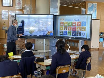 ストリートビューを使って説明をしているところの写真ですが、タッチパネルディスプレイは移動や拡大などが容易にできるので、効率的な授業には必要なアイテムです。