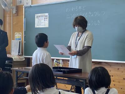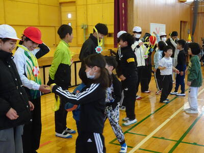 その後ドッジボールなどで楽しんだ後1年生から記念メダルをプレゼントしました。