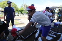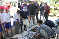 〇体育館集合、訓練について説明後、町内、家庭毎に並び替え