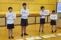 体育館で6年生を送る会。まず最初に6年生一人一人からの 〇・✕ クイズ