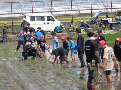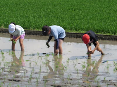 4週間前に種まきをした苗を全校児童で植えました。とても良い天気で、裸足で土の感触を楽しみながら楽しそうで田植えをしていました。保護者やJA青壮年部のみなさんにはお世話になりました。特に田植えまでの4週間管理して戴いたPTA環境部の方々には特に感謝いたします。