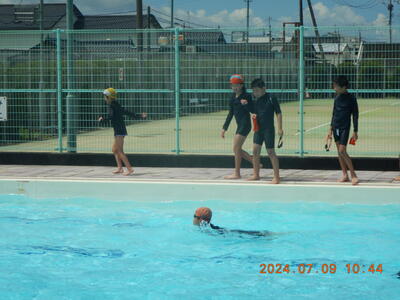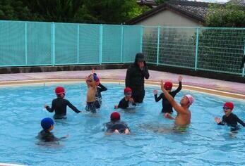 1学期最後の授業は、八代市教育委員会(15名)が視察される中で行いました。1・2年生は顔をつけてのけのび(顔をつけて壁を蹴って勢いで進む)、25m以上泳げるグループは平泳ぎ、それ以外の子供達はクロールが上達するトレーニングでした。週に1回の授業でしたが、授業のたびに上達していく姿がありました。