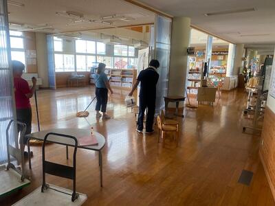 7月19にち(金)午前の終業式が終わった後、職員は会議と作業を行いました。少人数で学校全体の床にワックスを塗る作業は思っていたより大変な作業でした。