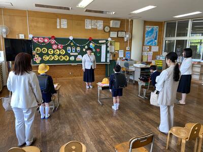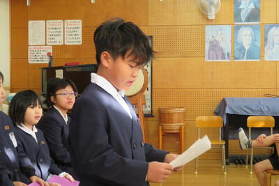 新入生は3人 担任の先導で緊張しながら体育館に入場し。担任の氏名点呼、式辞、祝辞、児童代表のりょうじさんの歓迎の言葉、話す人のほうを向いてしっかりと話を聞いていました。3人立派な態度をみて、これからがとても楽しみになりました。