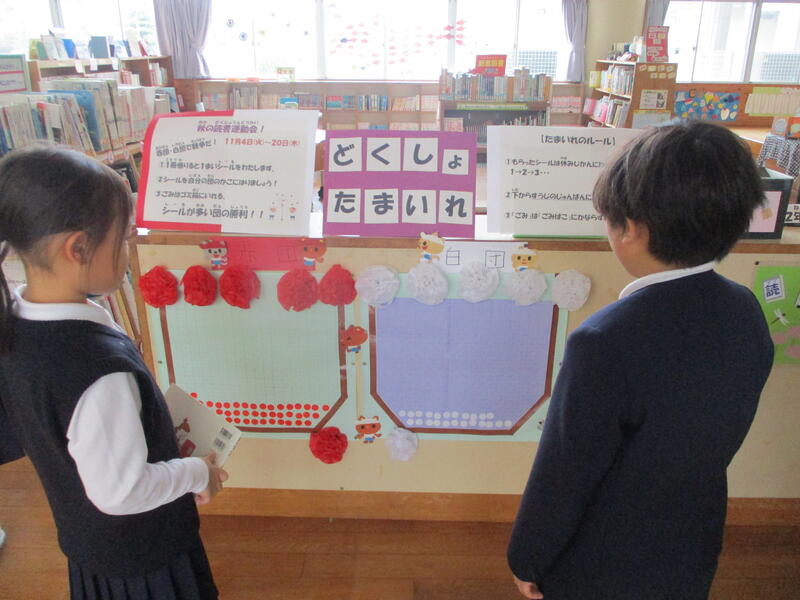 さあ!「読書の秋」です。恒例の読書月間がはじまりました!今回のイベントは、「読書ビンゴ」と「読書玉入れ」です。ビンゴが完成すると豪華賞品(しおり作り参加券)がゲットできます!1年生は、すでに200冊以上読んでいる人もいます。さあ、今年もあと5ヶ月となりました。何冊読めるかな?1人100冊以上目指して、がんばりましょう!