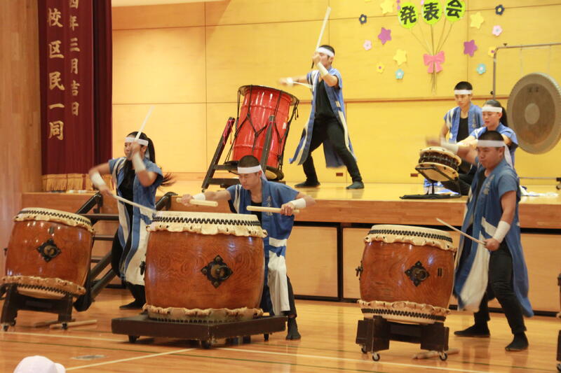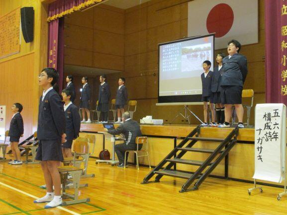 1・2年生の「音楽劇くじらぐも」、3・4年生の「農業の神様・松田喜一」、5・6年生の「構成詩ナガサキ」。どの発表も素晴らしく、たくさん練習した成果がでていました。そして、最後に「秀岳館高校雅太鼓部」の皆さんの迫力あるパフォーマンスがあり、全員で盛り上がりました。見ている人に元気と感動を届けた発表会でした。