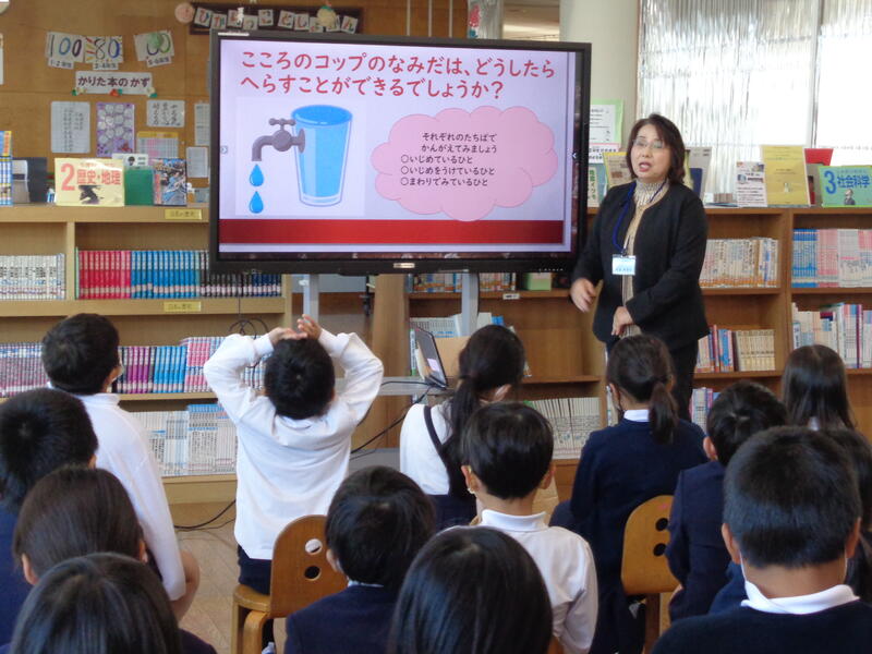 最後に校長先生の話で、いじめと「心のコップ」の話がありました。人は、それぞれしあわせに生きる権利をもっているので、温かい言葉かけや行動をして、笑顔いっぱいの学校にしていきたい、と話がありました。