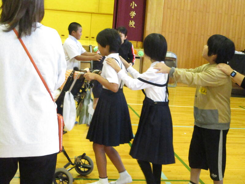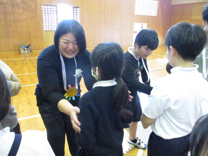 11月6日(木)に、八代支援学校の児童と3、4年生が交流活動をしました。最初は、とても緊張していました。しかし、自己紹介やゲーム等の遊びをしていくうちに、少しずつ緊張がほぐれて、お互いに笑顔が見えるようになりました。手作りのメダルのプレゼントを喜んでもらえたのがとても嬉しそうでした。楽しい時間をありがとうございました!
