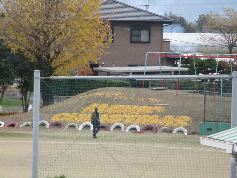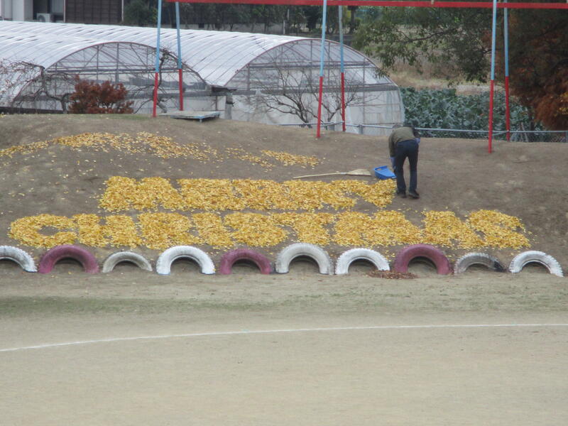 また、昭和神社のいちょうの木からたくさん葉っぱが落ちてきました。ふと見ると、学校施設用務員の先生のデザインで力の山に銀杏の葉っぱで「メリークリスマス」の文字が!!もうすぐ、2学期も終わります。