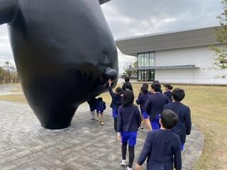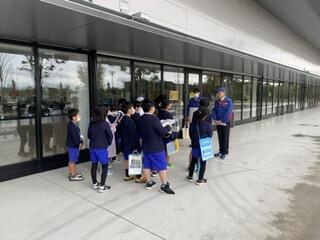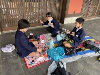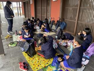 青空の下みんなで楽しく食べたかったのですが、雨なので軒下を借りました