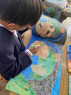 子供たちは、社会科見学で行った通潤橋を題材に水彩絵の具を使って色鮮やかな作品に挑んでいました。