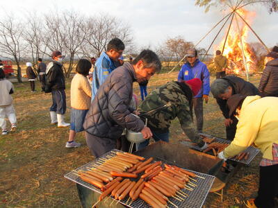 点火式に3人の子供達が参加しました。今年は集まった子供達にはお菓子以外にも大きなウインナーを準備してありました。4本も食べた子もいて満足していました。来年もたくさんの昭和っ子が参加してくれるといいですね。