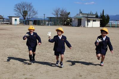1年生生活科で傘袋を使ったロケットをつくり青空に向けてこどもたちが力一杯飛ばしていました。