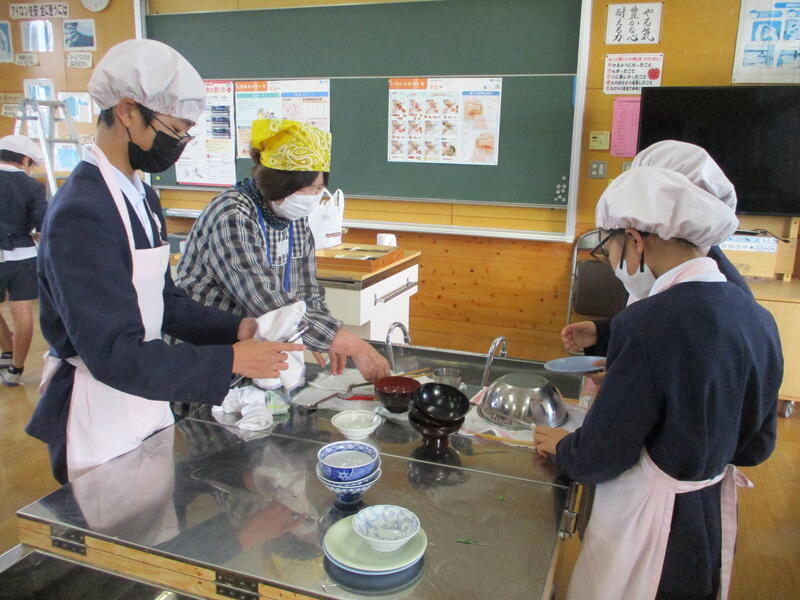 12月17日(水)に、5・6年生は調理実習を行いました。メニューは味噌汁とご飯。この日は、地域の方4名がお手伝いにきてくださり、火加減や材料の切り込み、味噌のたて方などをアドバイスしていただきました。いりこで出汁をとって、班ごとに違う具材をいれた味噌汁は、とてもおいしかったそうです。