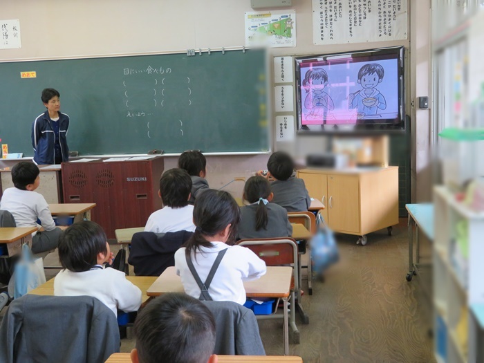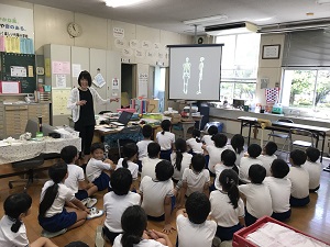 計測の前には、各学年にあわせて、熱中症や睡眠、朝ごはんについて等のお話を行っています。今日は4年生「骨について」のお話をしました。