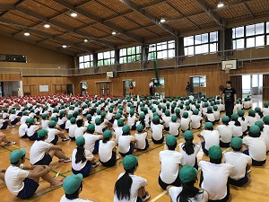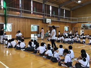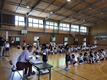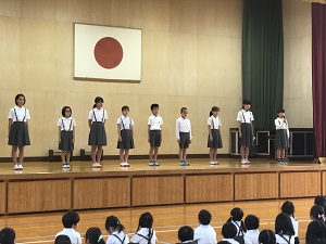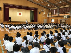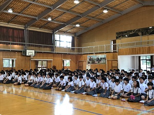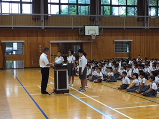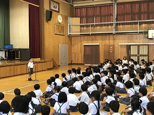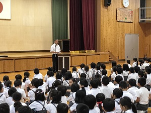 始業式では、校長先生が、熱中症予防について、行事を通し精一杯の成果をあげること、