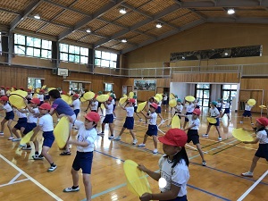 3,4年生は「花笠音頭」の練習中。「くいっ」と笠をかえすタイミングが難しそうでした。