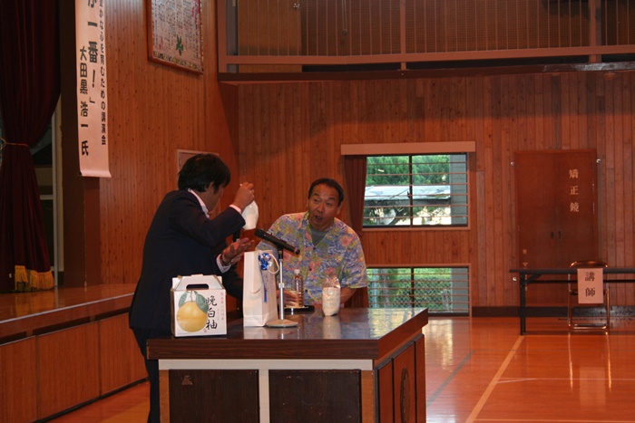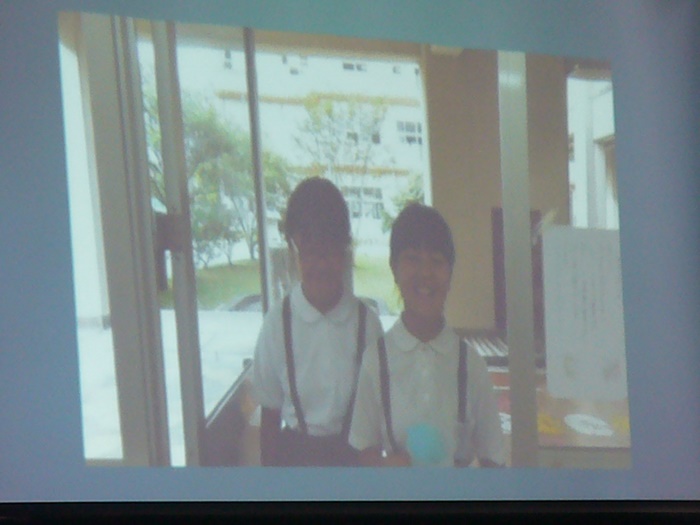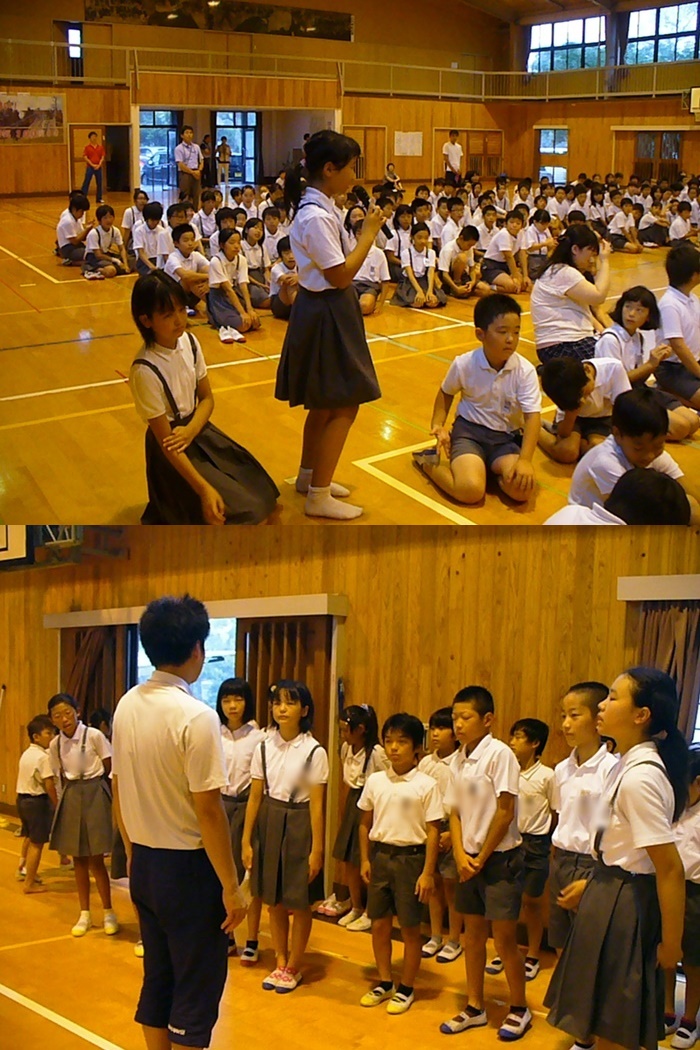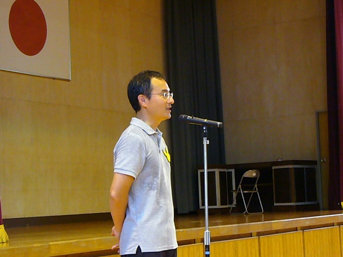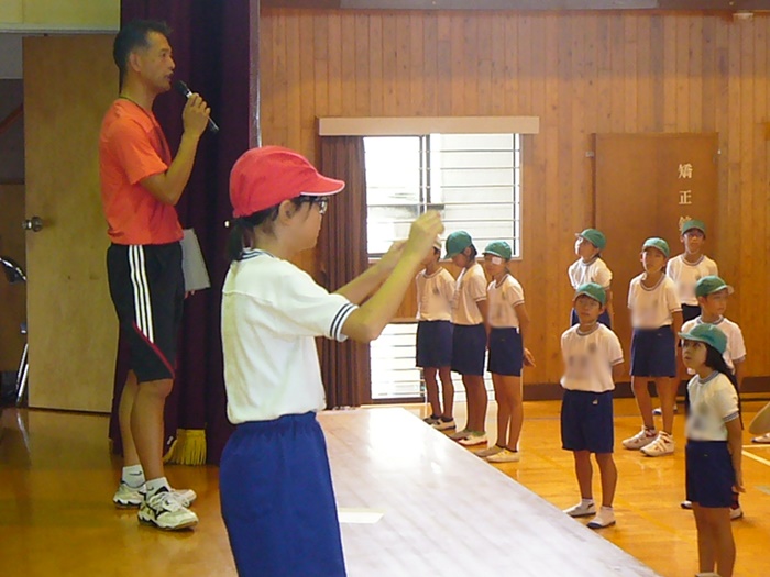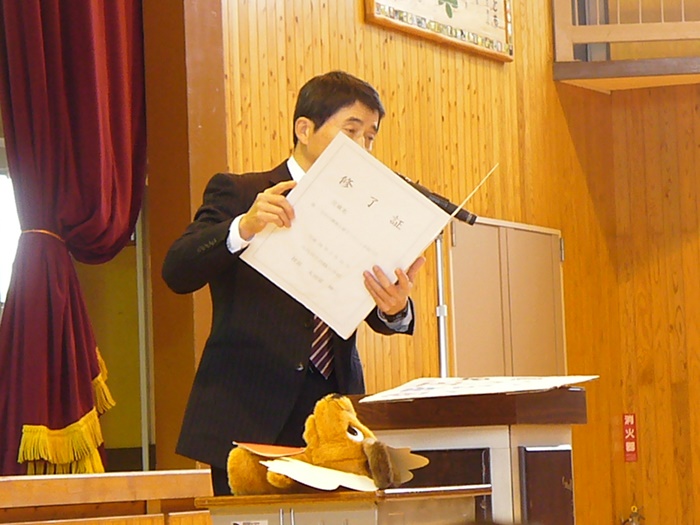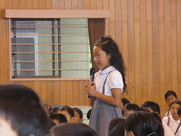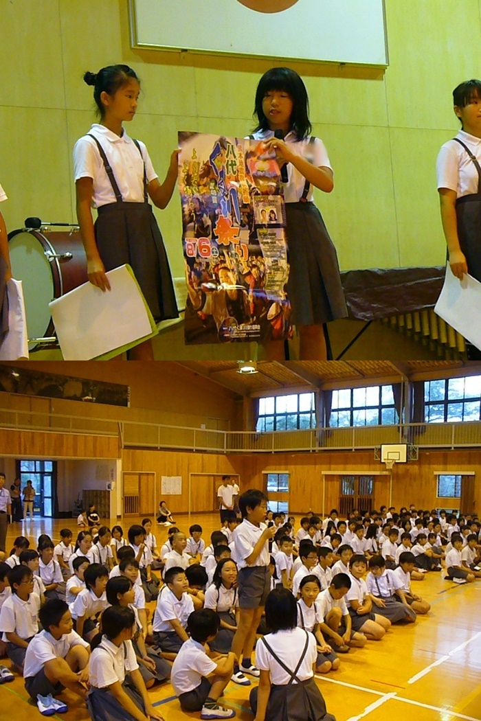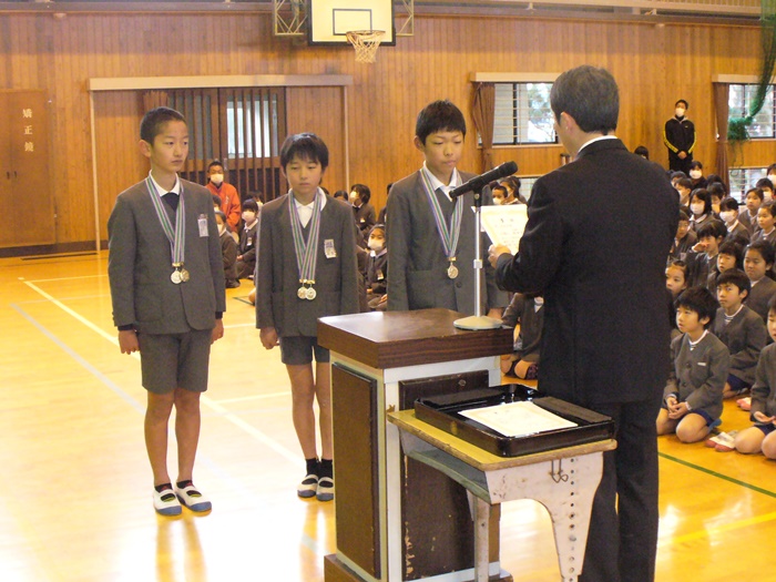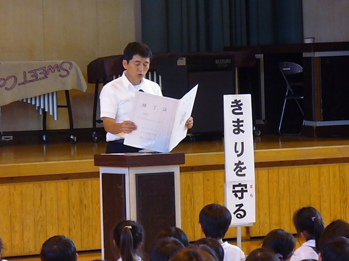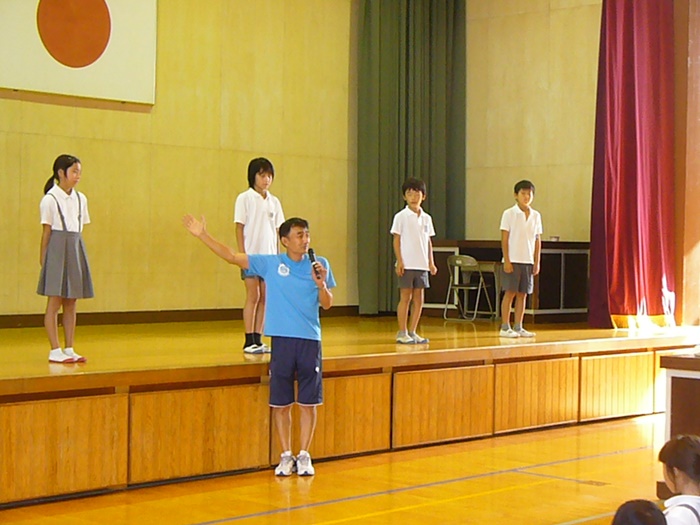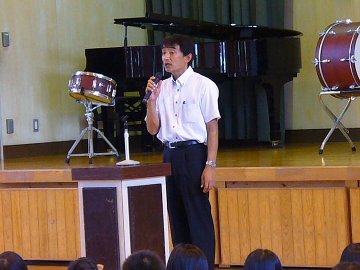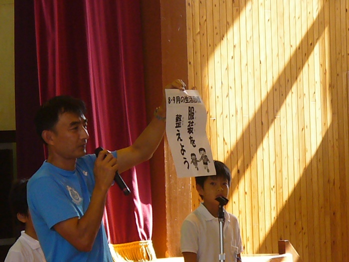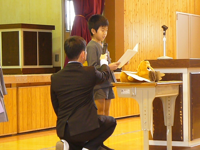 表彰が行われた後、校長先生は、大会での選手たちの頑張りを子供たちに一生懸命紹介されました。