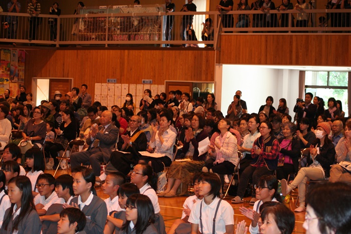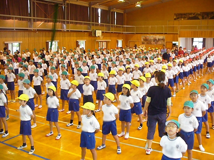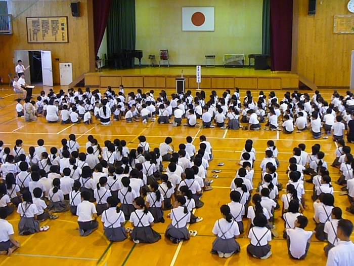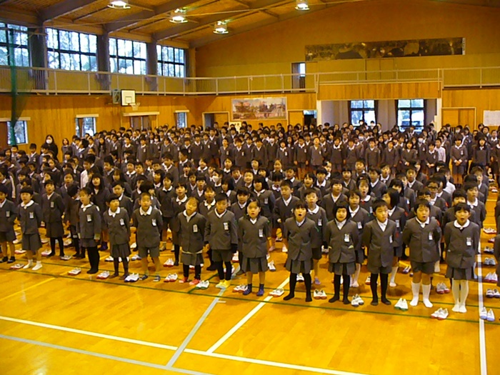 400人以上の子供たちがシーンとしてお話を聞いています。1年生も正座で頑張っていますよ。