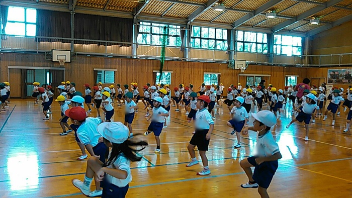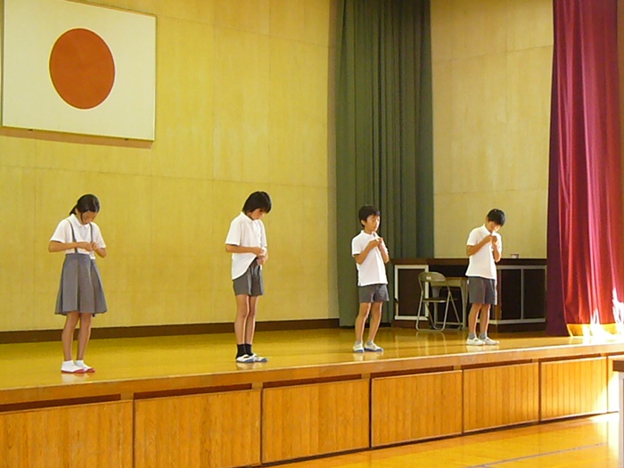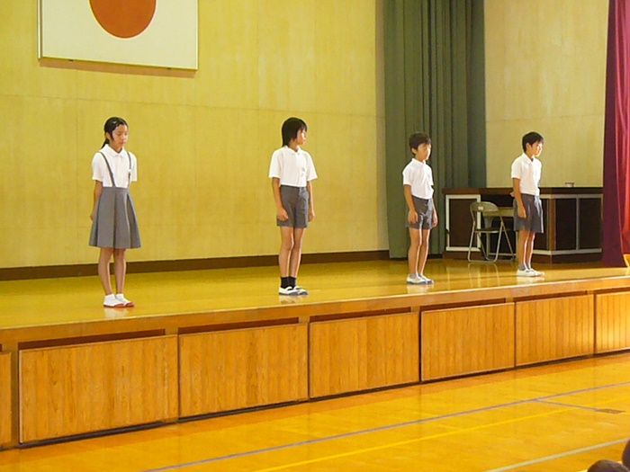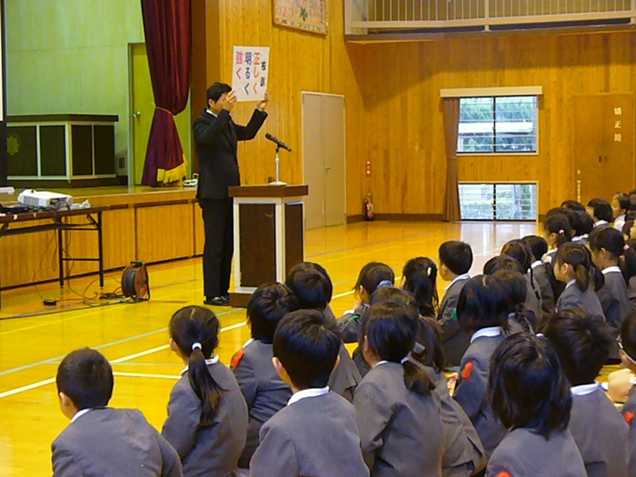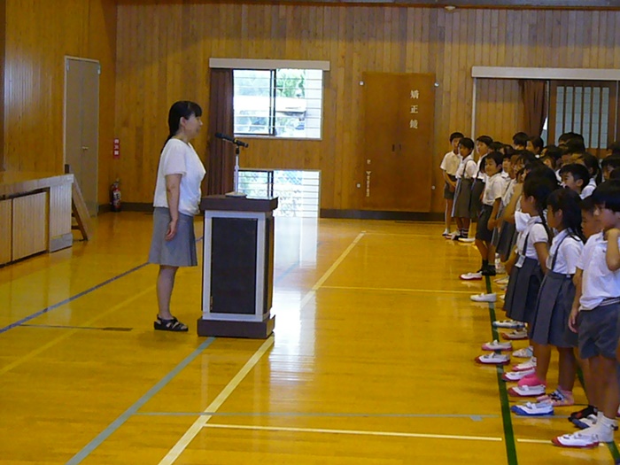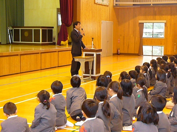 全校児童が集まり、先生方のお話を聞きます。お話の聞き方の練習の時間でもあります。