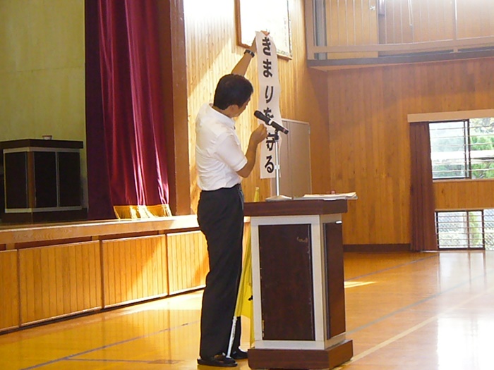 ↓校長先生が倒れられたわけではありません。駅伝大会の時に一生懸命走ってきた人がタスキを渡した後ばたりと倒れていたことをみんなに紹介されているところです。それほど一生懸命だったことに校長先生も本当に感動されていました。