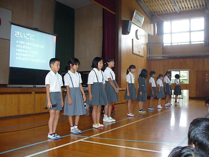 ↑今日の校長先生のお話は「やつしろスピリッツ」という生活の中でで守る約束のことでした。