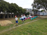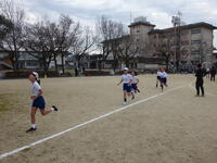 1~3年生は、内側のトラック周りを走ります。4~6年生は、トラック外の外周を走ります。