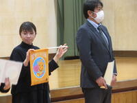 もう一つ表彰がありました。冬休みに6年生に新1年生へ渡す安全旗のデザインを考えてもらいました。提出された作品の中から8点に絞られ、PTA役員や地域の方、学校職員で8点を審査し、1点に決まりました。最終審査に残り、デザインに決定したのは、「うめした つかさくん」の作品です。おめでとうございます。