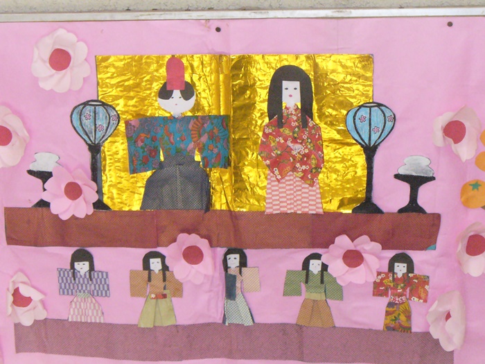 ひな祭りにちなんで、図書の先生がこんな飾りを階段の踊り場に掲示してくださいました。