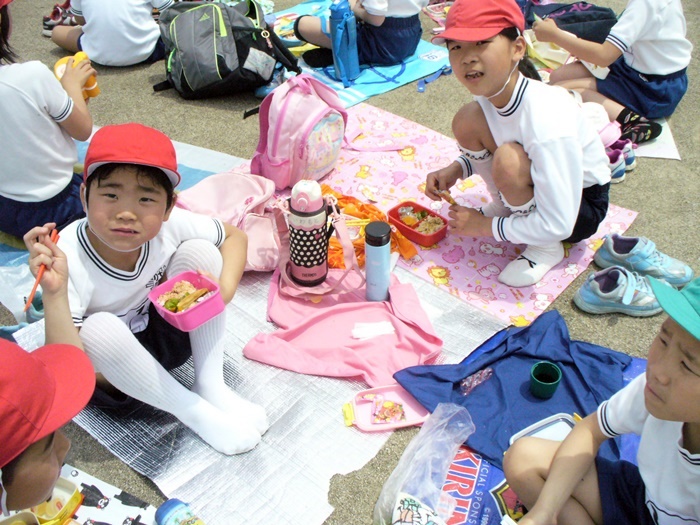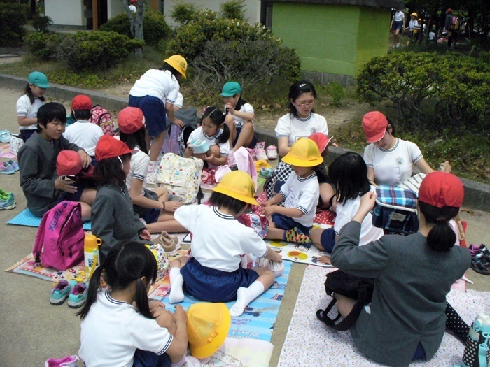 現地でも一年生のお世話は六年生がしました。一緒にお弁当を食べたり、遊んだりしました。