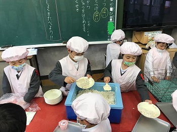 さあ、そんな一年生も、入学から3週間たち、給食の準備もできるようになりました。
