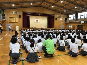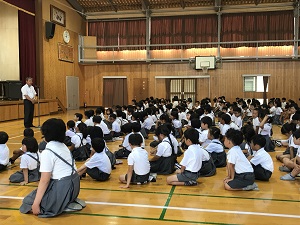 始業式では、校長先生が、熱中症予防について、行事を通し精一杯の成果をあげること、