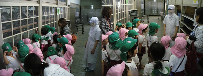 今日は、代陽幼稚園の年長さん、年中さんのみなさんが代陽小学校の給食室見学に来てくださいました。