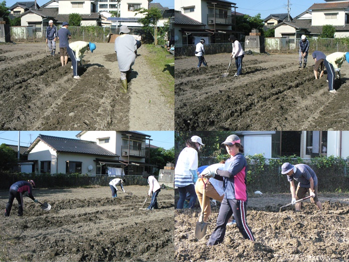 以前紹介した「おやじの会」(といってもお母さん方もいらっしゃいます)の皆さんと先生方で畝を作りました。