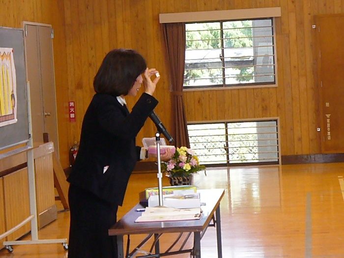 全校児童が集まり、先生方のお話を聞きます。お話の聞き方の練習の時間でもあります。