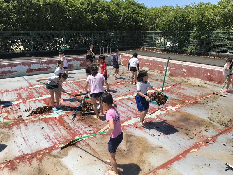 今日の3,4時間目は5年生、5,6時間目は6年生がプール掃除を行いました。