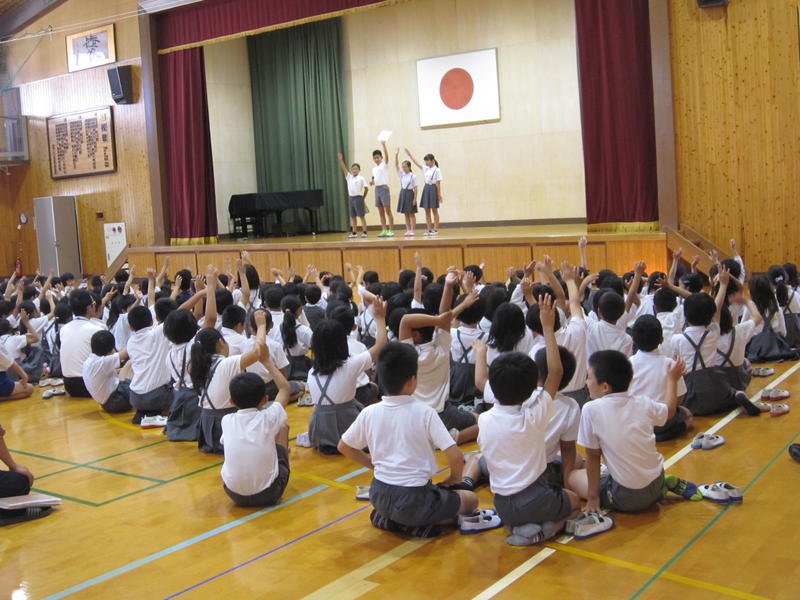 最後に、夏休み市の童話発表会に、代陽小学校の代表として発表を行う2年生の岡山くんの発表と、音楽会で発表する4年2組の発表がありました。4年2組のみなさんは、休み時間も毎日積極的に練習を続けてきました。とても美しい合奏と元気の良い合唱でした。当日も頑張ってください。